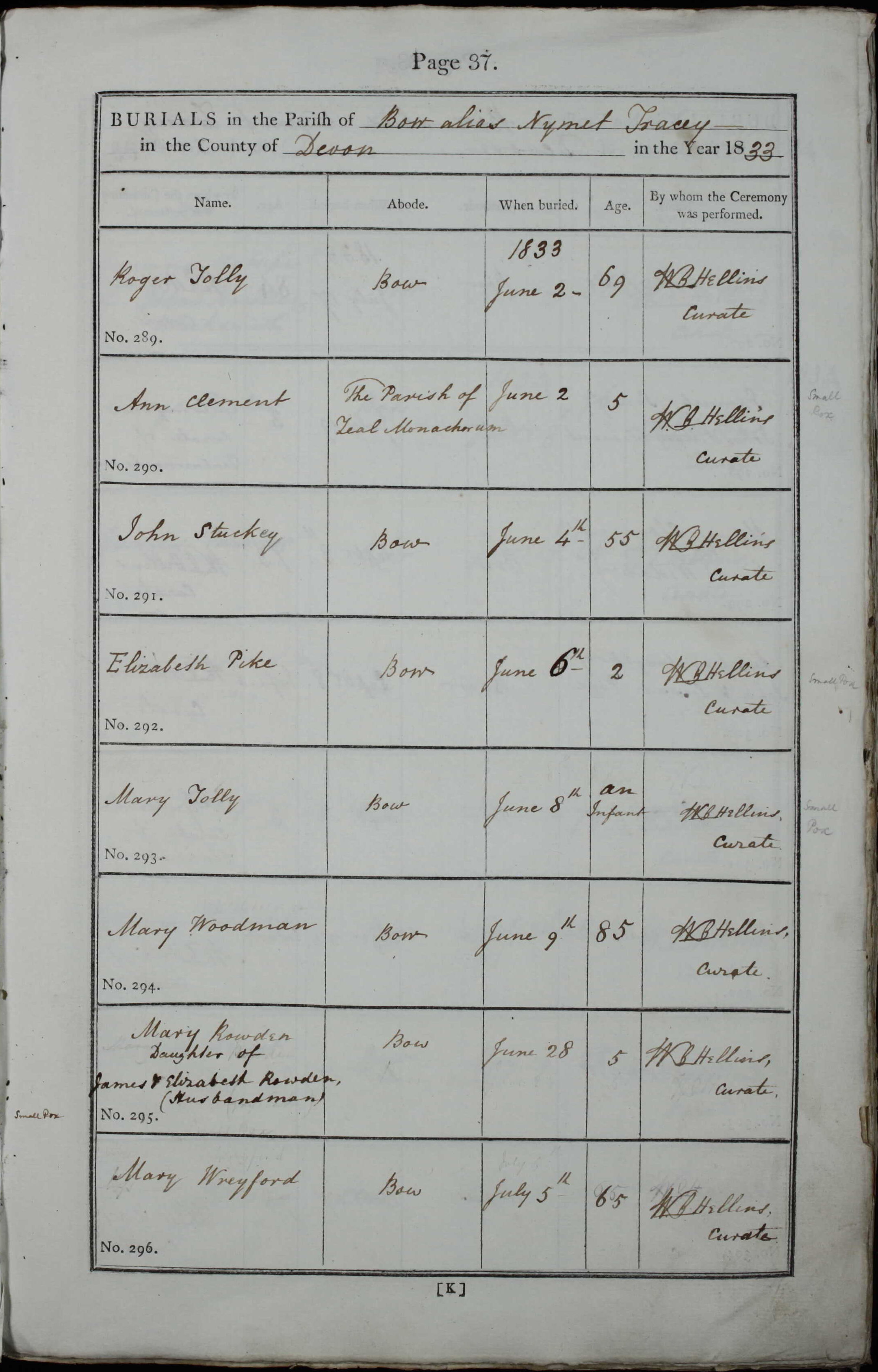 Occasionally in a burial register the date of death has been entered, usually as a note in the spine of the book.